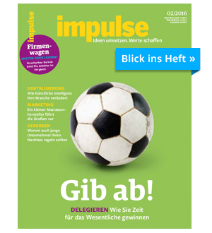 Abonnenten erhalten die neueste Ausgabe des Unternehmermagazins impulse jeden Monat frisch nach Hause geliefert. impulse gibt es auch zum Download als PDF sowie in einer mobilen Version für Tablets und Smartphones als impulse-App für Android und iOS. |